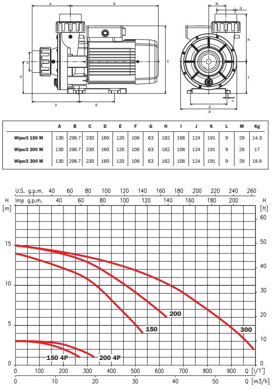 Bij de Wiper3 150 en 200 kan gekozen worden tussen een hoog en laag toerental. Dit kan een vaste keuze zijn of via een schakelaar te regelen zijn. In het diagram staan de pomp eigenschappen bij de 2- (2900 rpm) en 4- (1450 rpm) polige stand. De producteigenschappen gaan uit van de maximale RPM. Zie datablad voor exacte gegevens van de laag toerental stand.